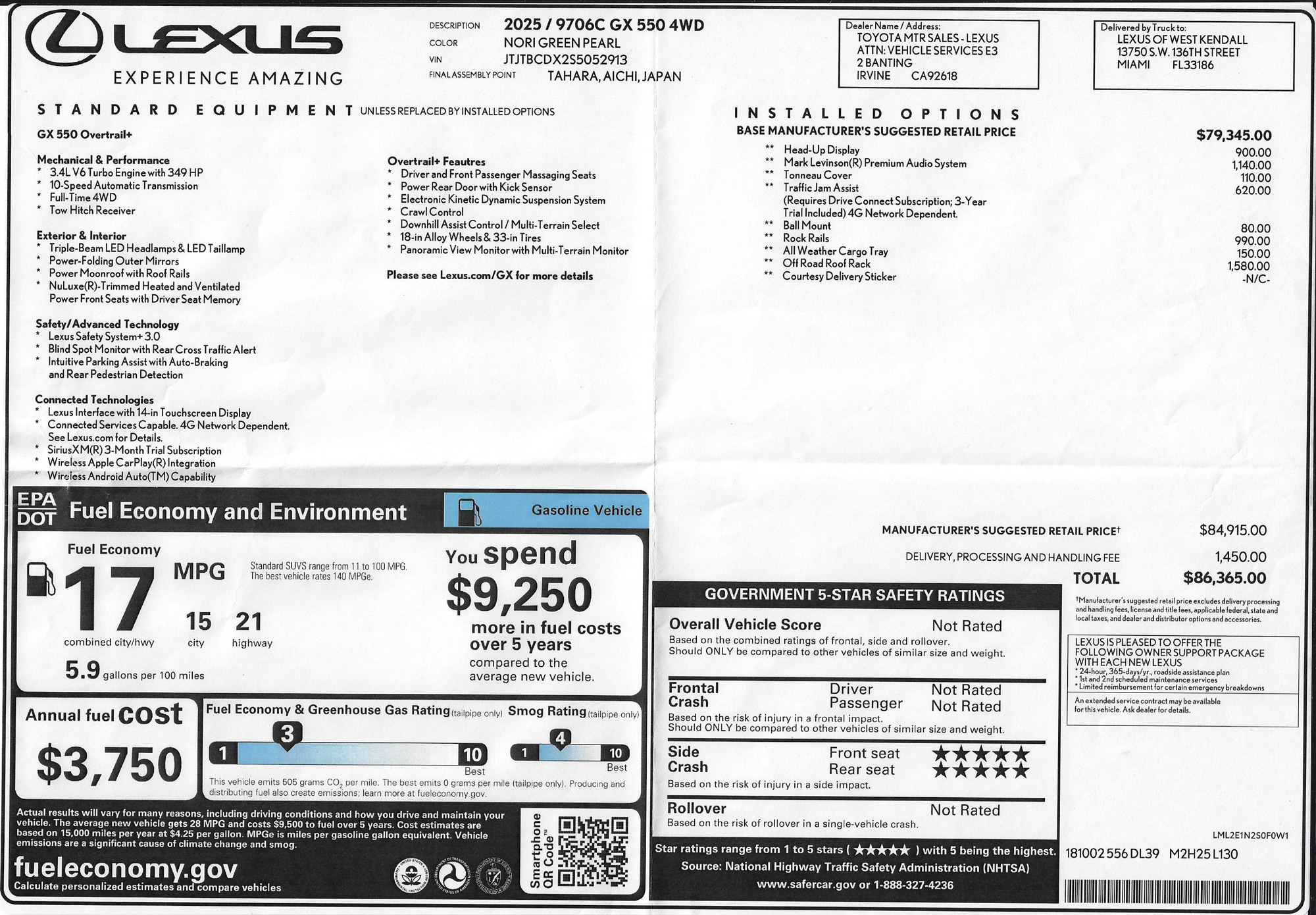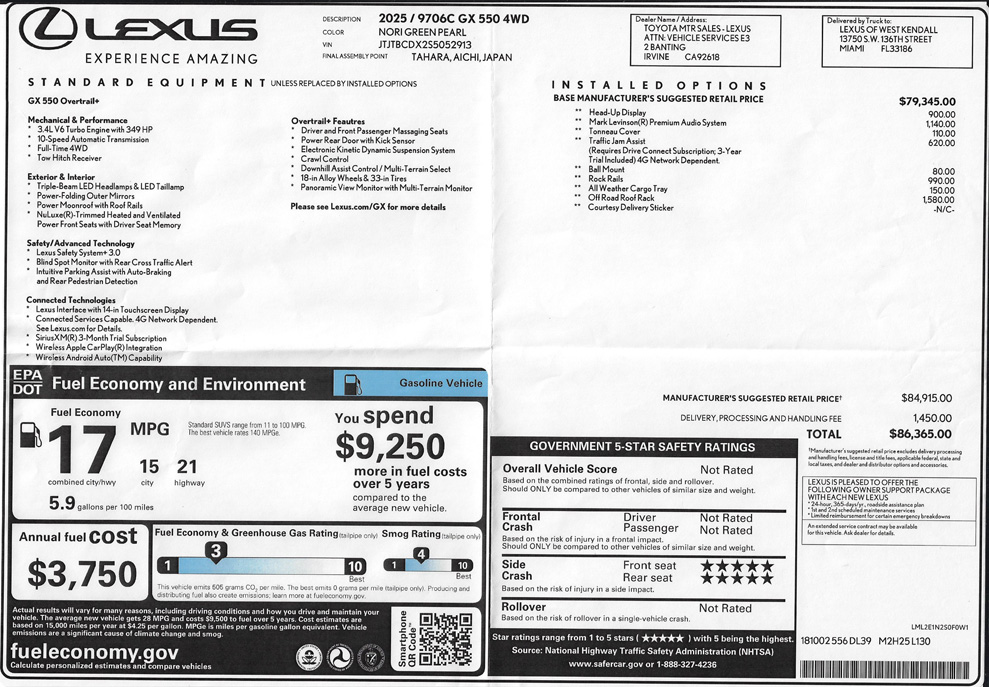 Precio inicial sugerido (MSRP) de $66,935 (incluye cargo por